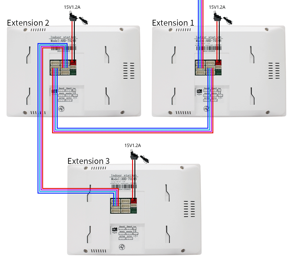 6.The indoor monitor is available in 7 inch or 10.1 inch touch screen sizes. 7 inch dimensions: 195x132mm; 10 inch: 253x164mm. Power supply: DC15V 1.2A for monitor; outdoor unit powered by indoor monitor.